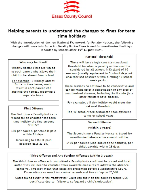 There is no entitlement to parents to take their child out of school during term time; however, you may apply to the school for leave of absence if you believe there are exceptional circumstances. Holidays during term time will not be authorised . If the absence is not authorised and the holiday is taken, the case will be referred to the Education Welfare Service, see below for an explanation of fines.